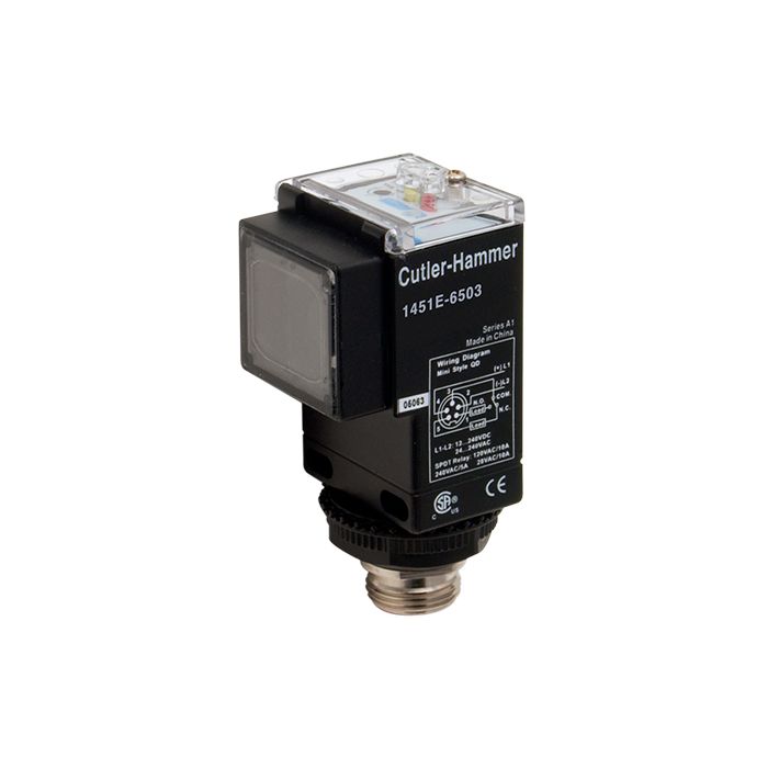 Eaton photoelectric sensor, rectangular, polarized retroreflective, visible red light emission, 16 ft sensing distance, selectable light-on/dark-on, adjustable, solid state relay, 4-wire, 4-pin mini connector and 7/8in - 16UNF thread.