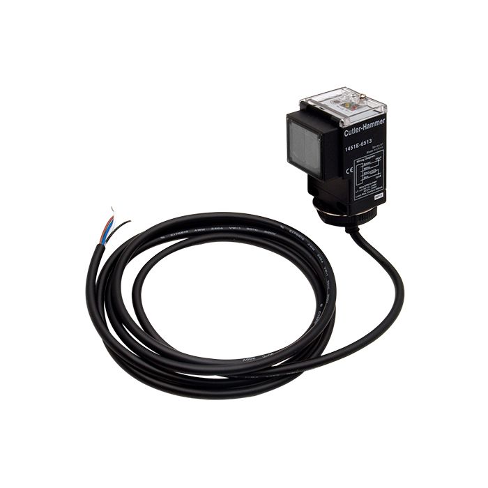 Eaton photoelectric sensor, rectangular, polarized retroreflective, visible red light emission, 16 ft sensing distance, selectable light-on/dark-on, adjustable, solid state relay, 4-wire, pigtail.