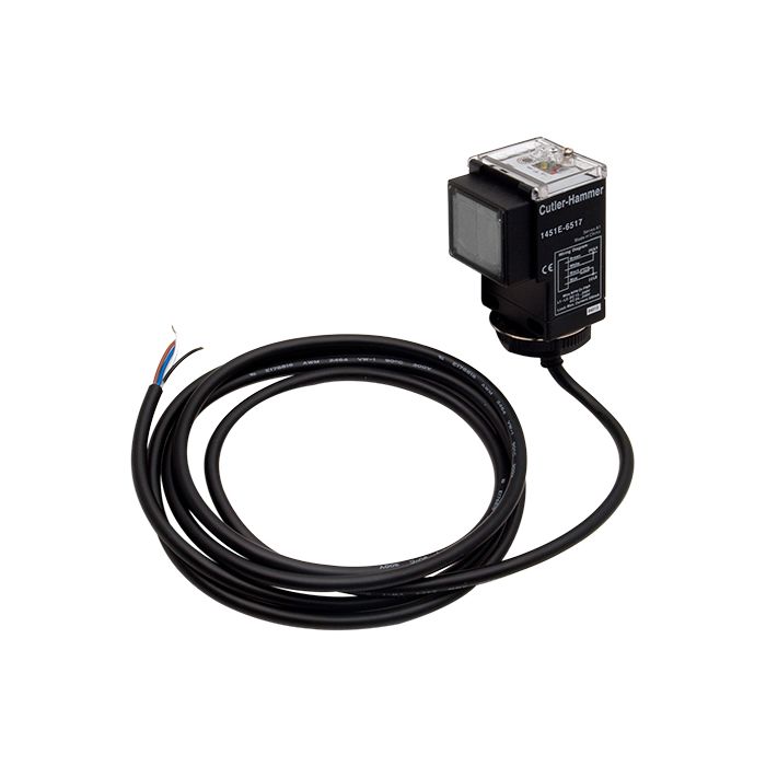 Eaton photoelectric sensor, rectangular, polarized retroreflective, visible red light emission, 16 ft sensing distance, selectable light-on/dark-on, adjustable, NPN / PNP, 4-wire, pigtail.