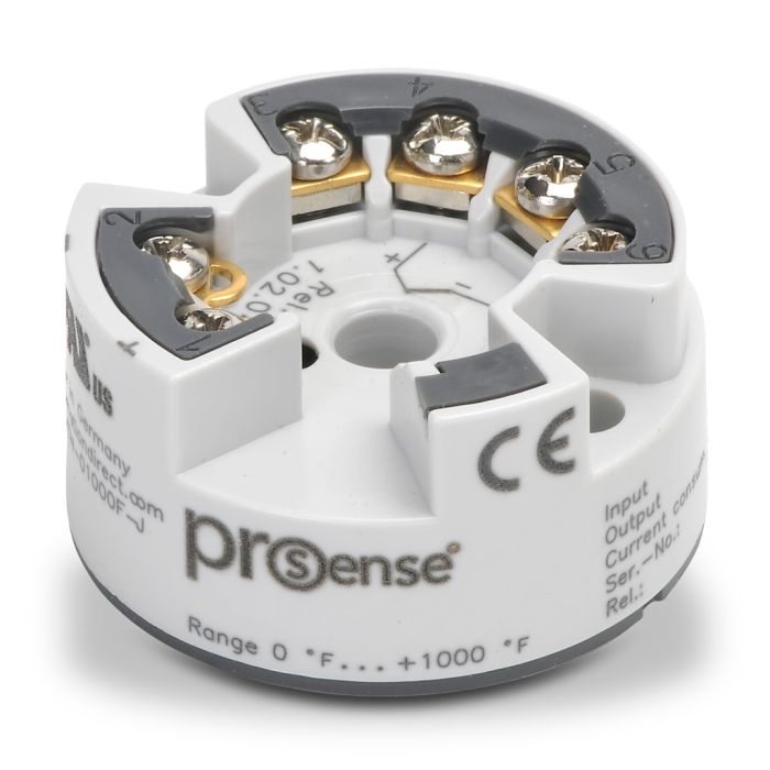 ProSense temperature transmitter, Type J thermocouple input, 4-20 mA output, 0 to 1000 deg. F fixed range, 8 to 35 VDC loop powered, connection head mount.