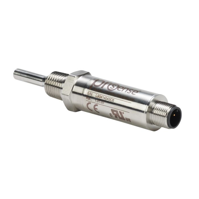 ProSense temperature transmitter, integral Pt100 RTD, -40 to 140 deg. F, 6mm probe diameter, 30mm insertion length, 1/4in MNPT process connection, 4-20 mA analog output, 4-pin M12 quick-disconnect.