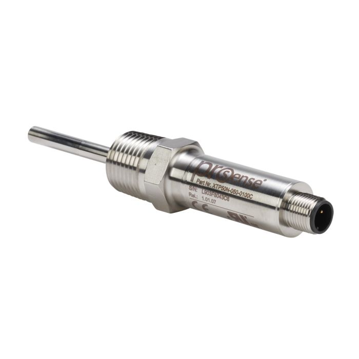 ProSense temperature transmitter, integral Pt100 RTD, 0 to 100 deg. C, 6mm probe diameter, 50mm insertion length, 1/2in MNPT process connection, 4-20 mA analog output, 4-pin M12 quick-disconnect.