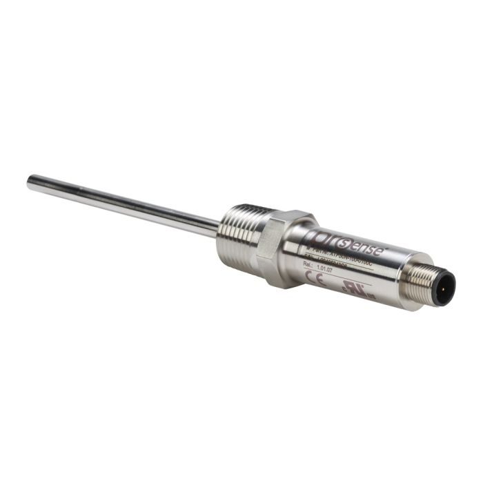 ProSense temperature transmitter, integral Pt100 RTD, 0 to 100 deg. C, 6mm probe diameter, 100mm insertion length, 1/2in MNPT process connection, 4-20 mA analog output, 4-pin M12 quick-disconnect.