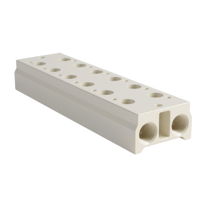 NITRA pneumatic valve manifold, aluminum, 6 stations, (2) 1/4in female NPT inlet(s), (2) 1/4in female NPT exhaust(s). For use with AVS-32 series directional control valves.