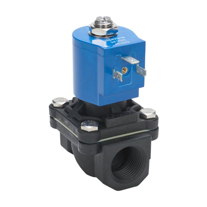 GC Valves water solenoid valve, 2-port (2-way), 2-position, N.C., piloted diaphragm, zero differential, Noryl plastic body, 3/4in female NPT inlet(s), 3/4in female NPT outlet(s), Cv=6.7, 24 VDC, 10W, 18mm DIN style wiring plug.