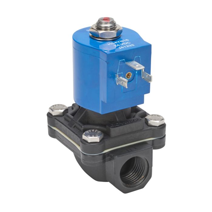 GC Valves water solenoid valve, 2-port (2-way), 2-position, N.C., piloted diaphragm, Noryl plastic body, 1/2in female NPT inlet(s), 1/2in female NPT outlet(s), Cv=4.3, 24 VDC, 10W, 18mm DIN style wiring plug.