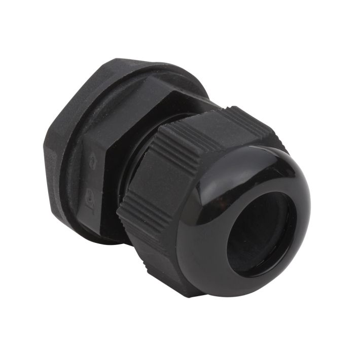 Bimed cable gland, PG16 thread type, polyamide, black, accepts 10 to 14 mm diameter cable, IP68. Package of 5. Mounting hardware included.