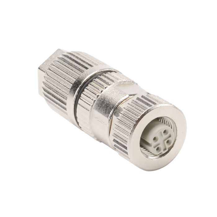Field wireable Ethernet connector, M12 D-coded 4-pole female axial, accepts cable diameter size 4.5-8.8mm, 26-22 AWG, insulation displacement (IDC) connection, shielded, IP65 and IP67. Exceeds Category 5E specifications.