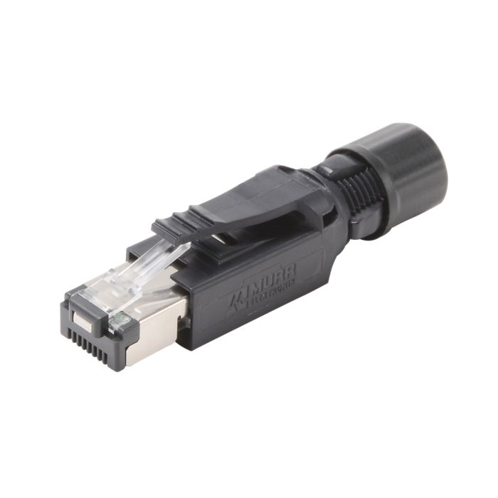 Field wireable connector, RJ45 4-pole Ethernet male axial, accepts cable diameter size 4.5-9mm, 26-22 AWG, insulation displacement (IDC) connection, shielded, IP20. Exceeds Category 5E specifications.