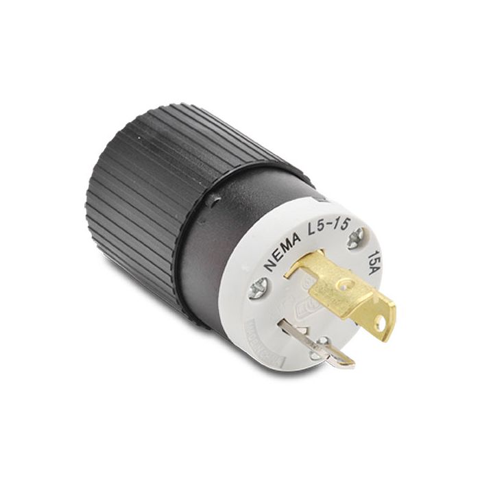 Locking plug, 15A, 125VAC, 2-pole, 3-wire, NEMA L5-15, cord clamp, black/white nylon housing, terminal cover, assembly screws, dust seal.