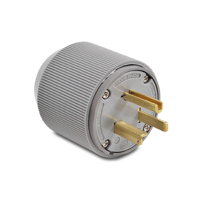 Straight blade plug, 30A, 125VAC, 2-pole, 3-wire, NEMA 5-30, cord clamp, thermoplastic housing, terminal cover, assembly screws, dust seal, gray housing.