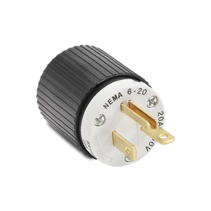 Straight blade plug, 20A, 250VAC, 2-pole, 3-wire, NEMA 6-20, cord clamp, black/white nylon housing, terminal cover, assembly screws, dust seal.
