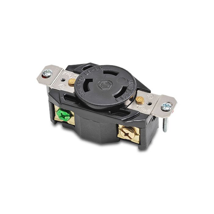 Heavy-duty single locking blade receptacle, 30A, 125VAC, 2-pole, 3-wire, NEMA L5-30, copper wire only, black nylon molded housing.