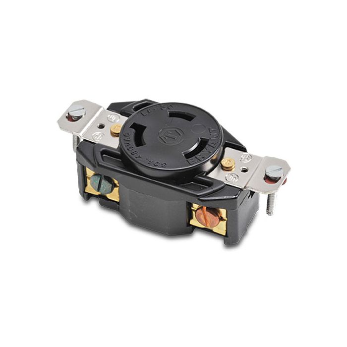 Heavy-duty single locking blade receptacle, 30A, 480VAC, 2-pole, 3-wire, NEMA L8-30, copper wire only, black nylon molded housing.