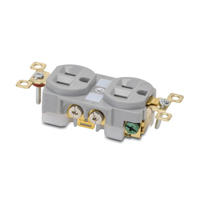 Heavy-duty straight blade duplex receptacle, 15A, 125VAC, 2-pole, 3-wire, NEMA 5-15, self-grounding, copper wire only, gray nylon molded housing.