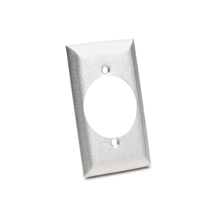 Stainless steel cover plate for 30A single receptacles, fits single-gang electrical boxes.