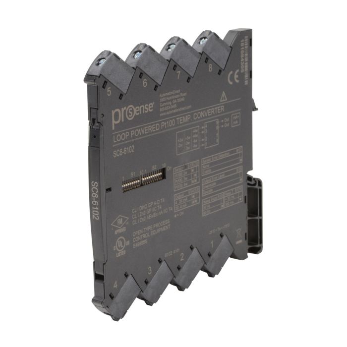 ProSense temperature transmitter, non-isolated, RTD input, current output, 3.3-35 VDC loop powered operating voltage, 35mm DIN rail mount, screw terminals.