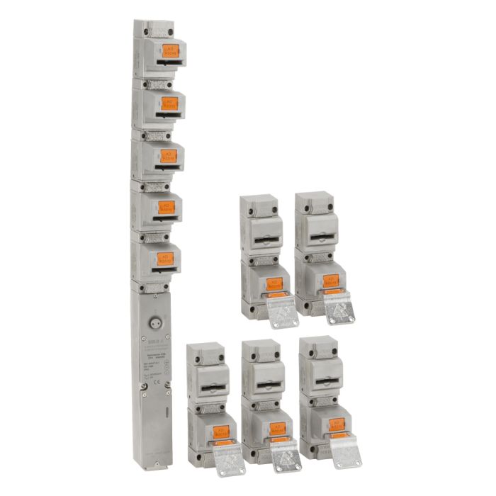 Dold Safemaster solenoid trapped key interlock system, five gate set. Includes (1) 316L stainless steel body interlocking safety switch with solenoid (24 VAC/DC), power to unlock, 1 N.C. and 2 forced opening N.O and N.C. changeover contacts for actuator tongue (key) status, 2 N.C. and 1 forced opening N.O and N.C. changeover contacts for solenoid status, one conduit opening that accepts M20 x 1.5 fittings, (10) 316L stainless steel coded trap key modules and (5) coded keys, (5) 316L stainless steel tongue (key) gate actuator modules. Order actuating tongue (key) separately.
